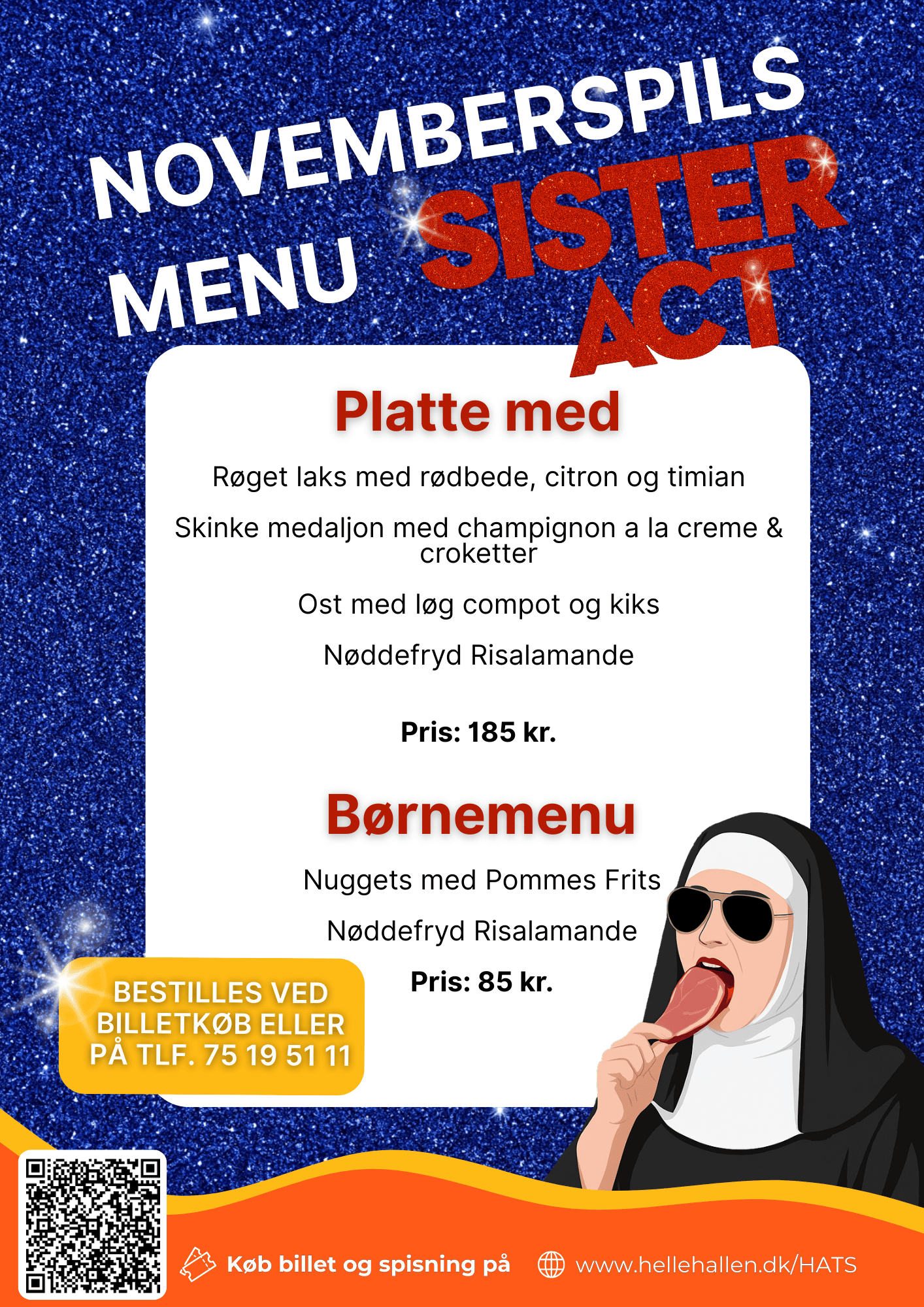| Spisning | Spisning kan tilkøbes under dit billetkøb eller ved at ringe på tlf. 75 19 51 11 |